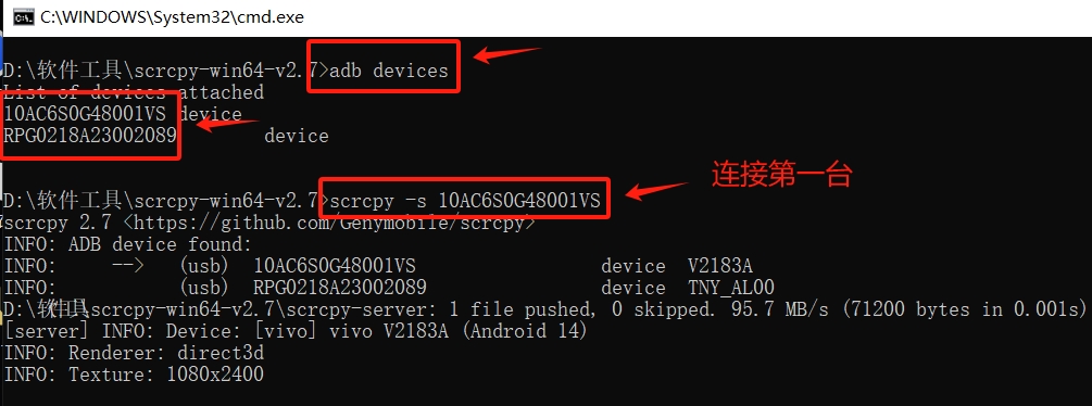 2. 输入adb devices查询已连接的设备,然后通过命令scrcpy -s [序列号] 来连接其中一台设备