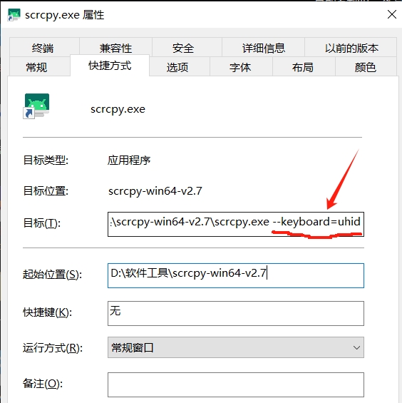 使用方式:建议在创建了scrcpy.exe文件的快捷方式中,右键点击“属性”,在“目标”项的最后加上“--keyboard=uhid”,再点击应用、确定即可