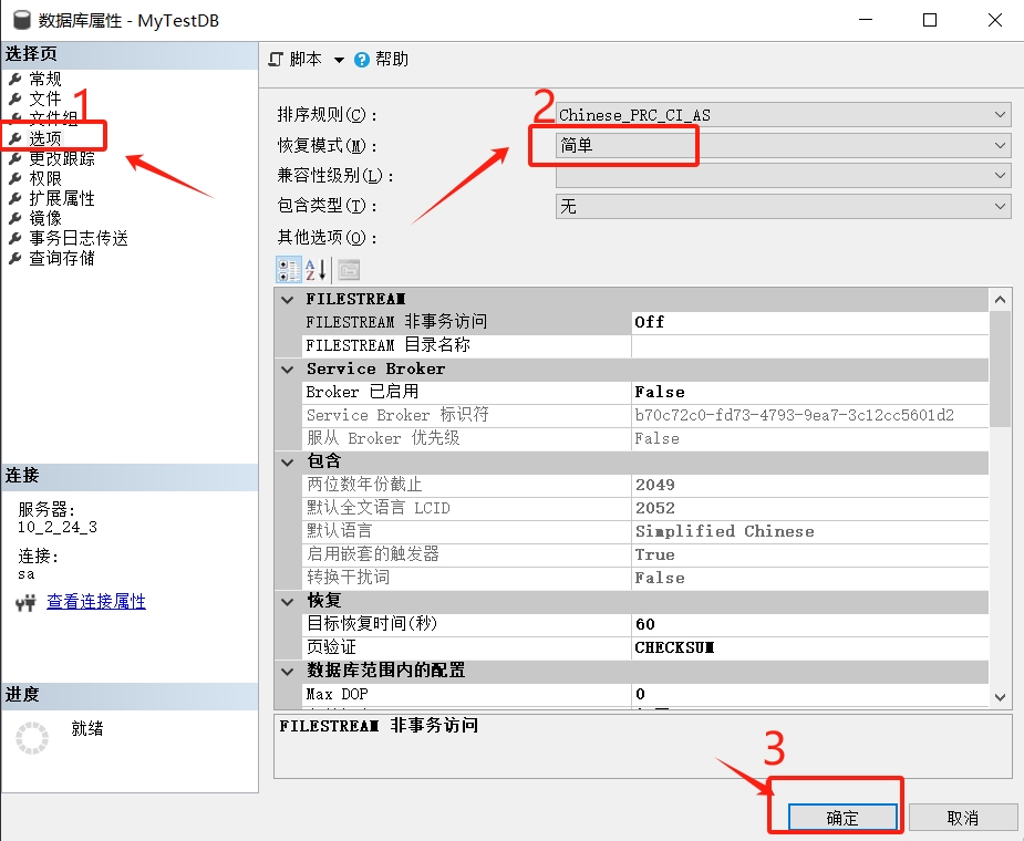 2:点击左侧选项,更改数据库恢复模式,将模式改为简单。