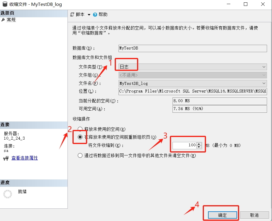 文件类型选择_日志_,并在【收缩操作】中将文件收缩到给出的_最小_值,这里的数据库因为是新建的没有数据,所以提供的_最小_值为0MB,可以将红框3中的数字修改为自己想要收缩到的大小。